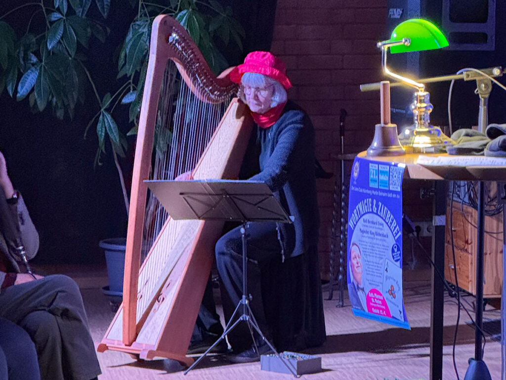 Jörg erstaunte die Leute mit einem Würfelbecher und dessen Inhalt (Würfel, Limette, Kartoffel). Matze entführte dann mit der Schnur eines Luftballons und dem Inhalt eines Turnbeutels die Zuschauer in ihre Jugend und nicht zuletzt verblüffte die Harfenistin Rita, die für die musikalische Umrahmung des Abends zuständig war, die Leute im Saal mit einem Zaubertrick, bei dem jeweils vier Löcher in ein kleines Blatt Papier geschnitten wurden. Einfach wunderbar!